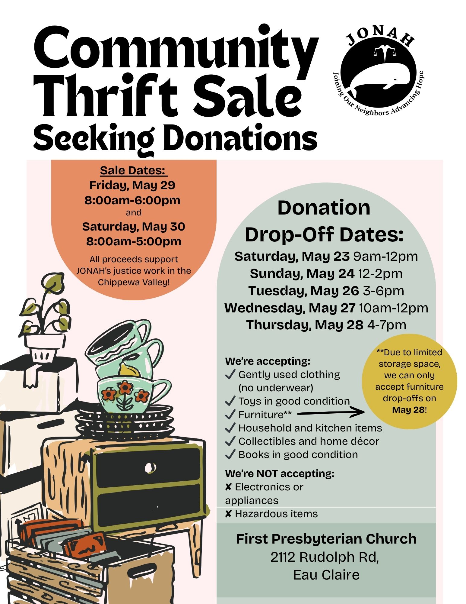 Have you started your spring cleaning? At the end of May, JONAH will be accepting gently used items for our second annual Community Thrift Sale. This year, the sale will happen at First Presbyterian Church in Eau Claire on May 29-30. See the full list of donation drop-off days and details on the flyer below.
