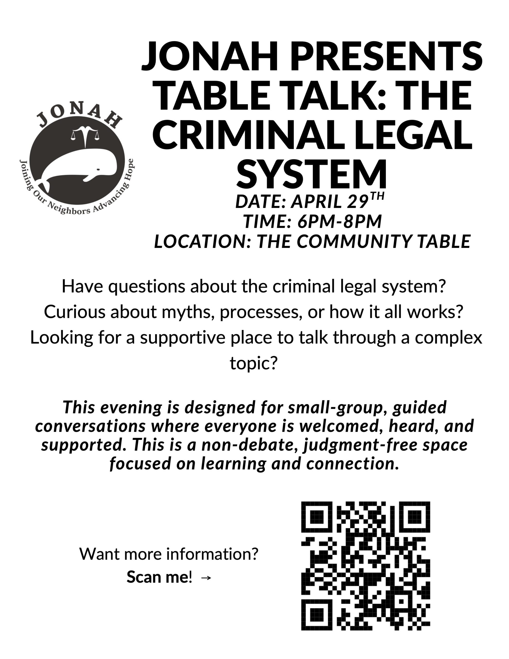 With or without personal experience, you’re invited to come ask questions and learn about the criminal legal system on Wednesday, April 29. This low-pressure event includes small groups of 4–5, conversation starters, people with lived experience at each table, and facilitators to support respectful dialogue. You’ll also hear about community resources and advocacy opportunities.